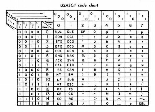 1960 ASCII or American Standard for Information Interchange was a guide for the binary codes that correspond to characters on a keyboard and beyond. Since a computer can not simply read text that we humans are used to, it must use the language of binary to output the type of characters desired. ASCII used seven-bit numbers for the computer; in other words, each character would correspond to a binary number (0s and 1s) with seven values. For example, "i" would be "1101001" in binary. ASCII is still used today; however, UTF-8 has become the most popular character encoding system.